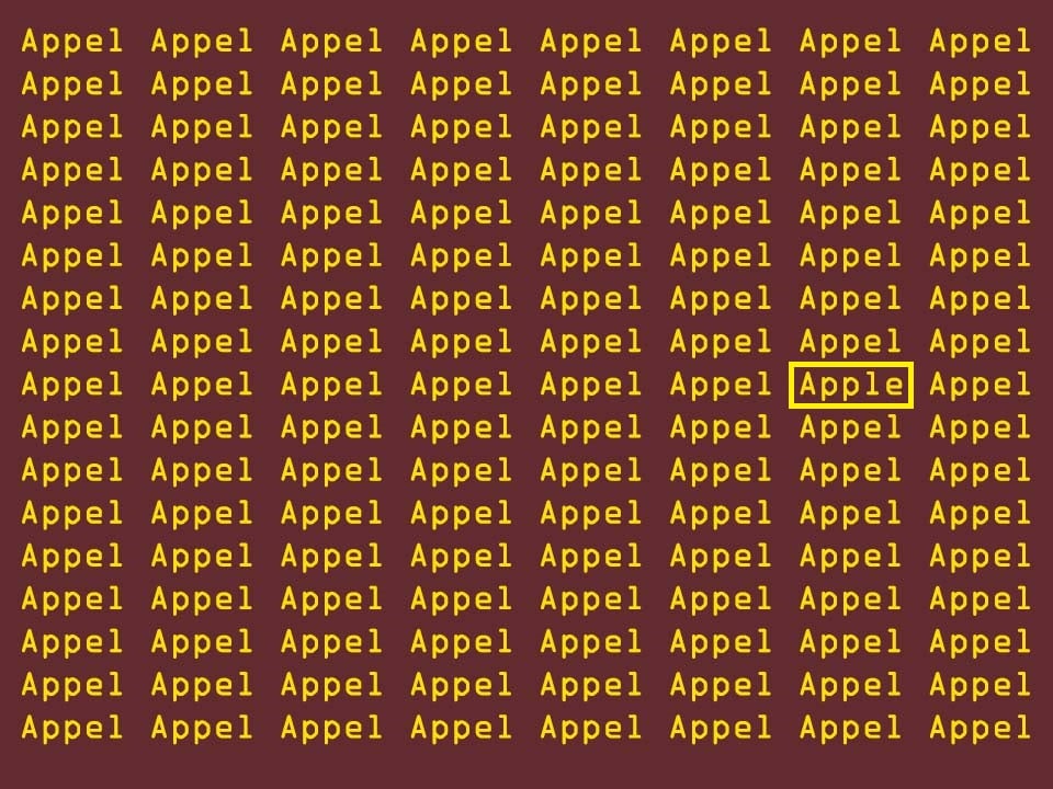Optical illusions like this blend repeating patterns, similar letter shapes, and distracting colors to trick the brain into missing small differences. At first glance the grid looks like a sea of similar words and letters, but tucked somewhere inside is the exact sequence A-P-P-L-E. The limited time adds pressure, forcing viewers to speed up their scanning and rely on sharp visual recognition rather than casual glancing.